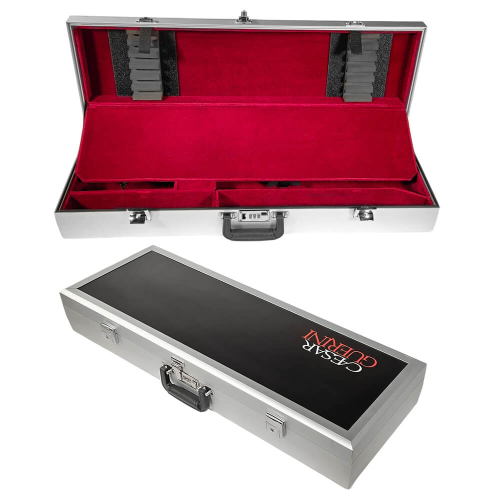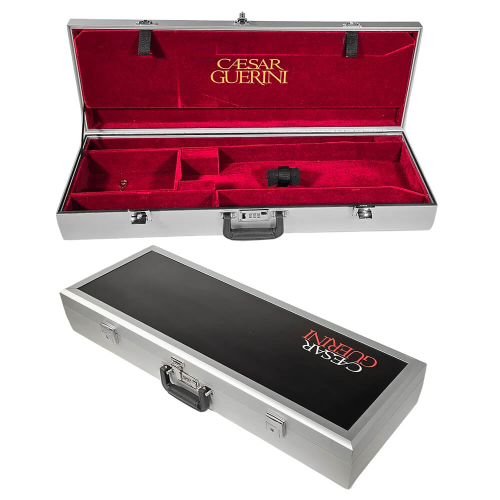 This is a custom designed Caesar Guerini branded case from the Americase Premium Series designed for your Caesar Guerini over/under skeet shotgun with Briley tube sets. The sturdy, anodized aluminum frame and extremely strong side panels yield a case that resists warping and dents. This case is designed with compartments for the stock, barrel with fore-end on and storage areas. Inside the lid is a separate compartment designed to hold your tube sets. The interior is covered in a beautiful red velvet which is not just for looks, but also for protection. Caesar Guerini logo is embroidered into the lining of the case lid. Your gun stock is secured with a grip strap. This case comes with two high quality key-lockable latches and a combination lock that meets airport security guidelines. The outer case features a vinyl Caesar Guerini logo.
