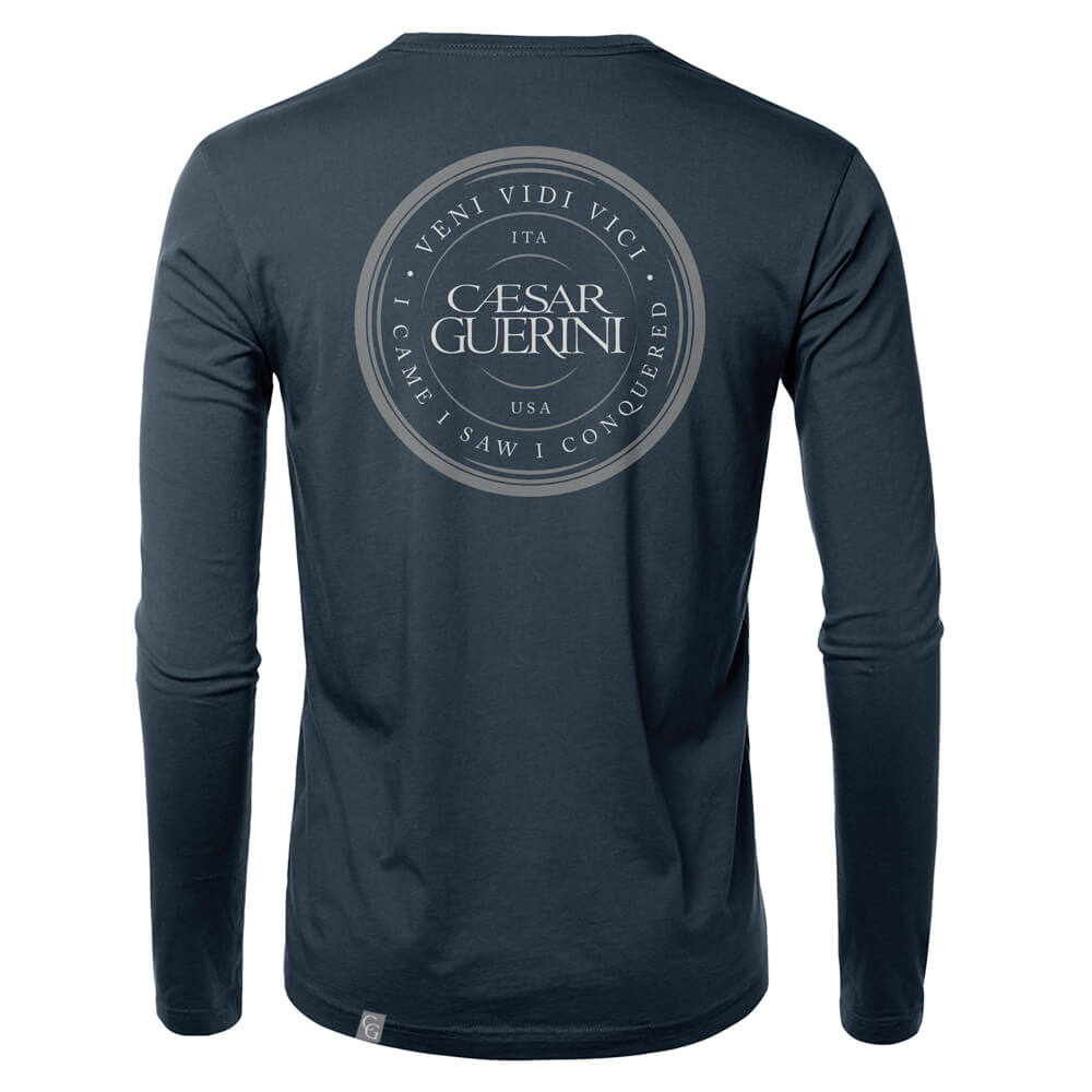 6.5oz. Heavyweight, soft-washed, 100% combed ring-spun cotton, and a 1×1 ribbed collar with Lycra for enhanced durability. What does all that fancy wording mean? It says this heavy duty long-sleeved tee is built like a tank! And it’s smooth to the touch. Tagless inside neck for superior comfort, yet has a tailored woven label on the back pocket for a premium aesthetic. Flip over the label to reveal a hidden message. Front logo is white and silver metallic, while the back graphic resembles your favorite shotgun shell in a modern design intertwined with our iconic “Veni Vidi Vici” mantra and English translation: “I came. I saw. I conquered.”