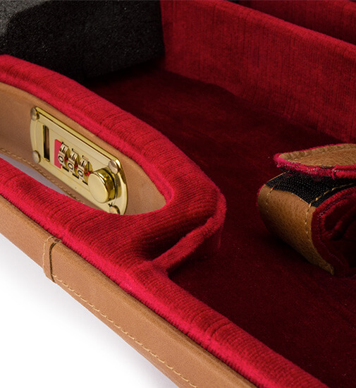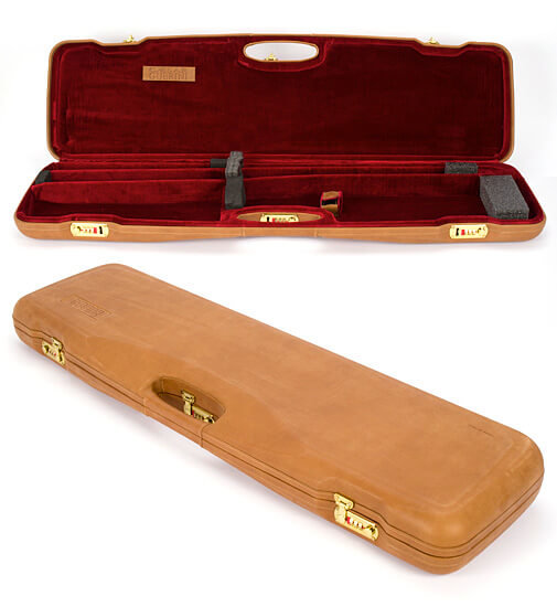 Sale!Premium Italian leather two barrel case for sporting and field models. Case will accommodate barrels up to 34″. Includes detailed embossing and embroidered insignias.