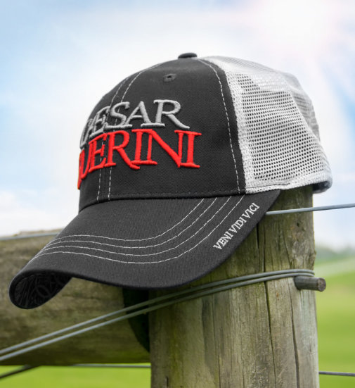 Mid profile structured heavy brushed cotton twill and mesh cap with six panels and adjustable snap back enclosure. The front of the hat features raised CG logo embroidery. Below the visor features a printed engraving pattern. On the brim of the hat it reads “Veni Vidi Vici” (I Came, I Saw, I Conquered!). Other custom features through-out this premium hat.