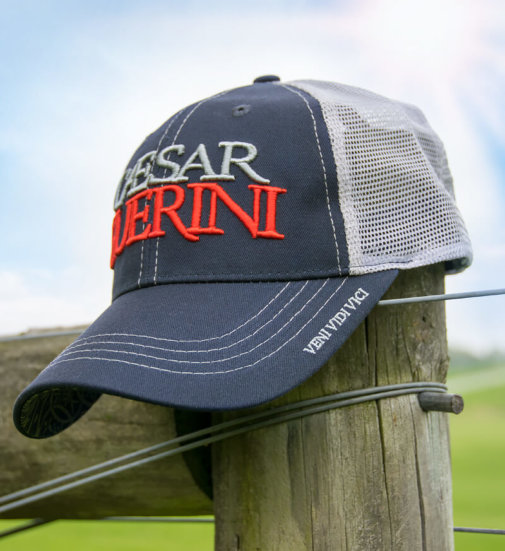 Mid profile structured heavy brushed cotton twill and mesh cap with six panels and adjustable snap back enclosure. The front of the hat features raised CG logo embroidery. Below the visor features a printed engraving pattern. On the brim of the hat it reads “Veni Vidi Vici” (I Came, I Saw, I Conquered!). Other custom features through-out this premium hat.