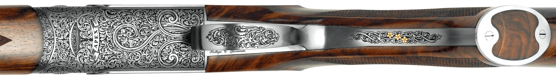 At Caesar Guerini we have a driving passion for innovation and elevating the gunmaker’s art, and this commitment to quality has produced the Apex. It has distinctly British lines with a classic Prince of Wales grip and our trim, rounded fore-end, but what really sets this gun apart is its revolutionary full-length trigger guard. We’ve eliminated the screws for a clean, seamless look, and the end of the guard terminates in a perfectly fitted skeletal grip cap for a touch of elegance. The action is embellished with full-coverage engraving that incorporates no fewer than four different techniques, and the frame’s hand-polished coin finish is treated to our Invisalloy® coating, which makes the metal rust-resistant while enhancing the contrast in the engraving.
