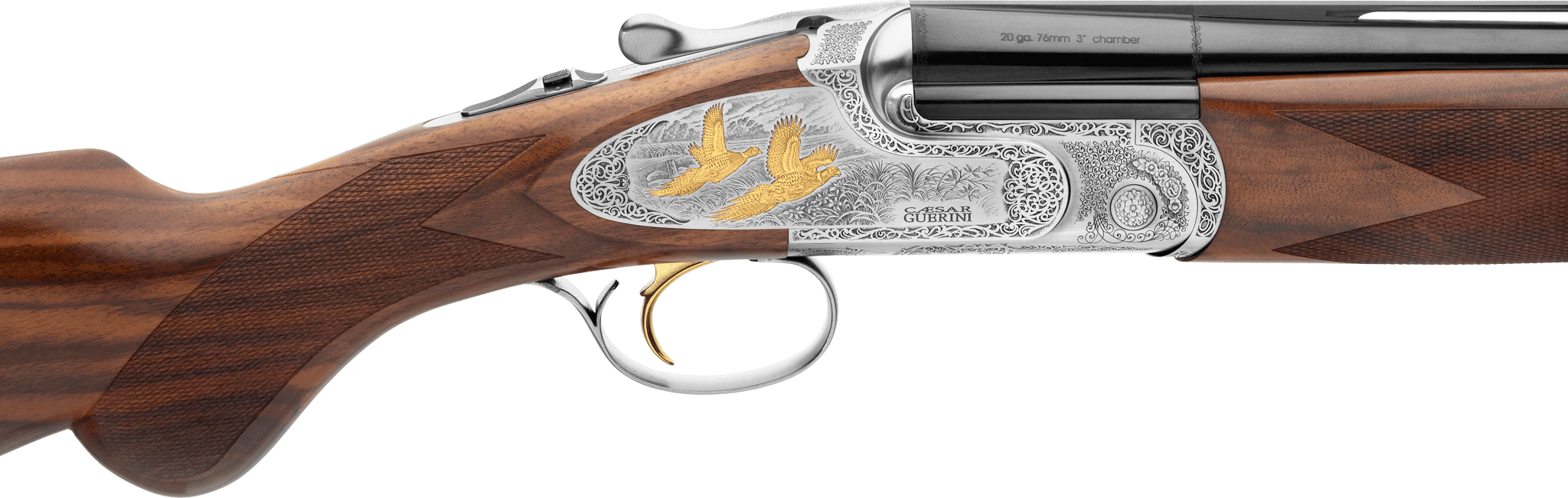 Chosen as the best new shotgun by a panel of experts at Outdoor Life Magazine, the Magnus Light is truly an extraordinary shotgun. Now we have decided to make it even better. We have dramatically enhanced the engraving with ornamental scroll and gold game scenes while not changing the price. It weighs an astounding six pounds in twelve gauge and barely over five pounds in 20, 28, and .410 gauges. Every detail is carefully considered to reduce weight and maintain balance. The frame and fore-end iron are machined from a solid forging of the best aircraft grade aluminum alloy. Durability is insured through the use of hardened steel at all high-wear points. To make the gun as light as possible and maintain perfect balance, we hollow the stock and craft the fore-end hardware from the same alloy as the receiver. If you hunt demanding terrain or just appreciate a light, responsive bird gun, the Magnus Light is the shotgun of choice. Every Caesar Guerini field gun comes with a velvet lined lockable hard case and five precision patterned flush chokes (CYL, IC, M, IM, F). A plastic choke case is also included.